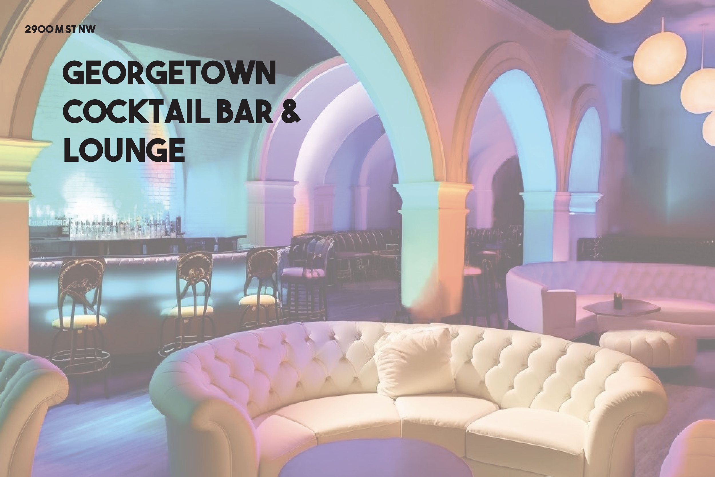Georgetown Cocktail Bar & Lounge is for young adults in the DMV area, specifically those that reside near Georgetown. The space is divided in half to separate the cocktail bar from the lounge, providing two different experiences for the guests. There are open spaces for dancing and movement, private tables for conversation, and multiple bars for socializing. The first floor is designated towards promoting casual social interactions by including sofas, occasional chairs, and a spacious bar. The second level provides more standard seating options to make the experience more formal and intimate. Georgetown Cocktail Bar & Lounge will provide young adults with a new social outlet in the DMV area.